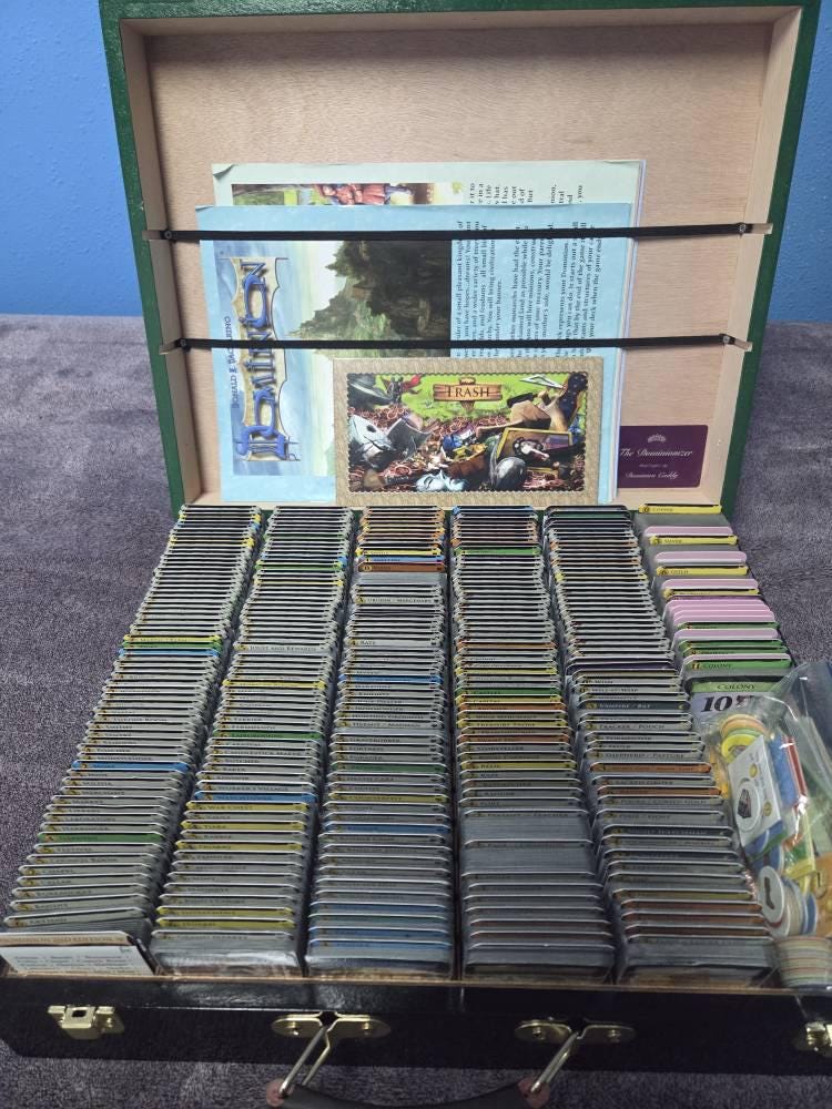 This is such a beautiful case!! All my dominion material fits literally perfectly, not stuffed too tight, not packed too loose. I have base game with extra for 5-6 players, plus 10 expansions. My calculations gave me 4319 cards total, and my cards are sleeved. Amazing fit. Also the case seems to be very high quality, not feeling strained with all that weight(case with all those cards weighs about 35 pounds). And can I just say, the seller has some of the best customer service I've ever come across! Thank you so much, Steve! I had so many questions just to make sure for myself that this was really worth the price, and my cards would all fit, and he answered all of my questions with plenty of detail, and very quickly. I am so happy with my purchase.